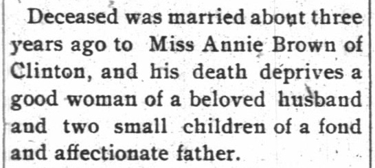 Then, in October 1899, Buck McCrabb died at their home in Navidad, Jackson County. A horse fell on him while he was running a hog. He lingered, unconscious, until the following night. His body was taken to Cuero on the afternoon Southern Pacific train for burial in the family graveyard.