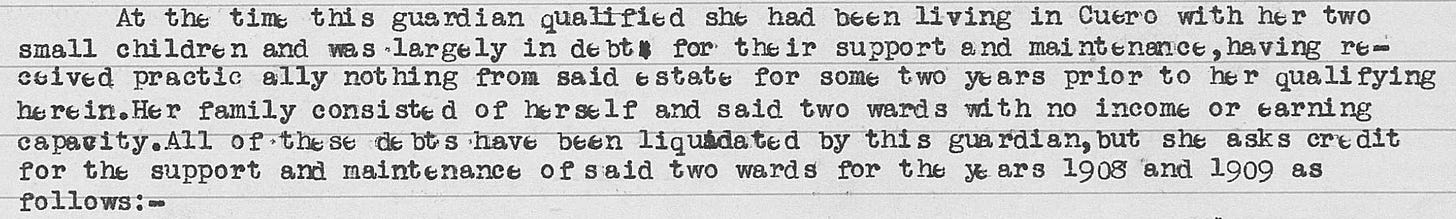 The most revealing document of Annie’s widowhood is a guardianship exhibit she filed in DeWitt County Court in 1912, looking back over the entire period since she had taken charge of her sons’ affairs. It reads like an accounting of a life lived on almost nothing.