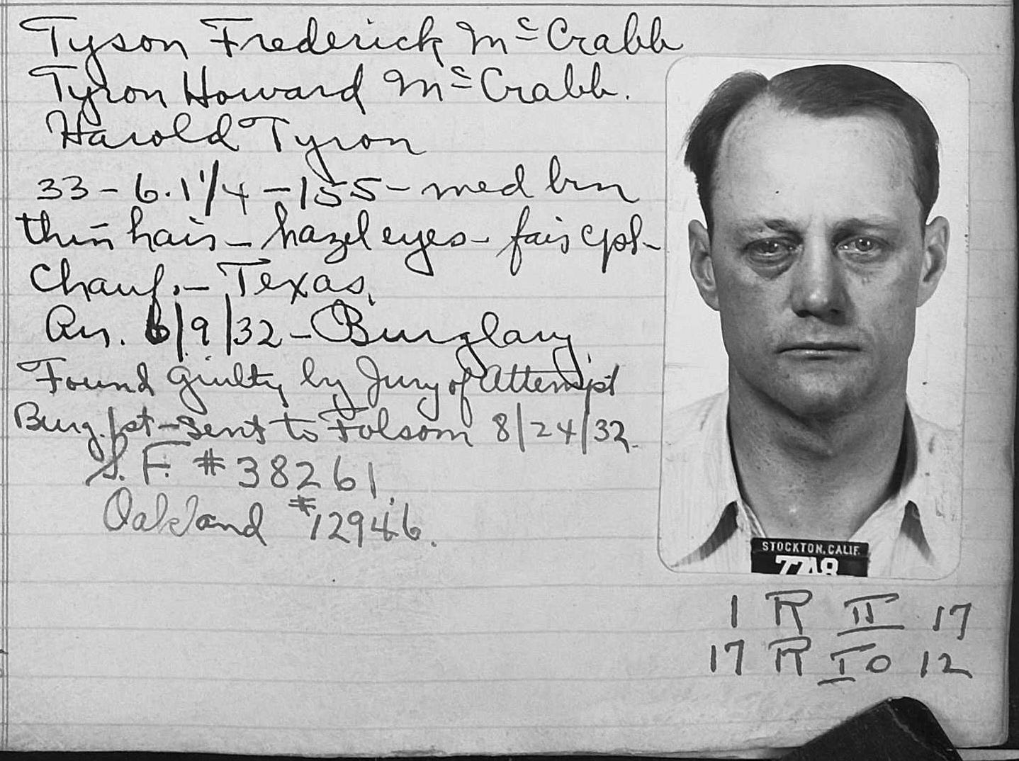 California, U.S., Prison and Correctional Records, 1851–1950; San Quentin State Prison, Prison Registers, 1945–1947; prisoner no. 18034, Tyson McCrabb; received 10 July 1945; crime: attempted burglary, first prior; term: 0–20 years, San Joaquin County; digital image, Ancestry.