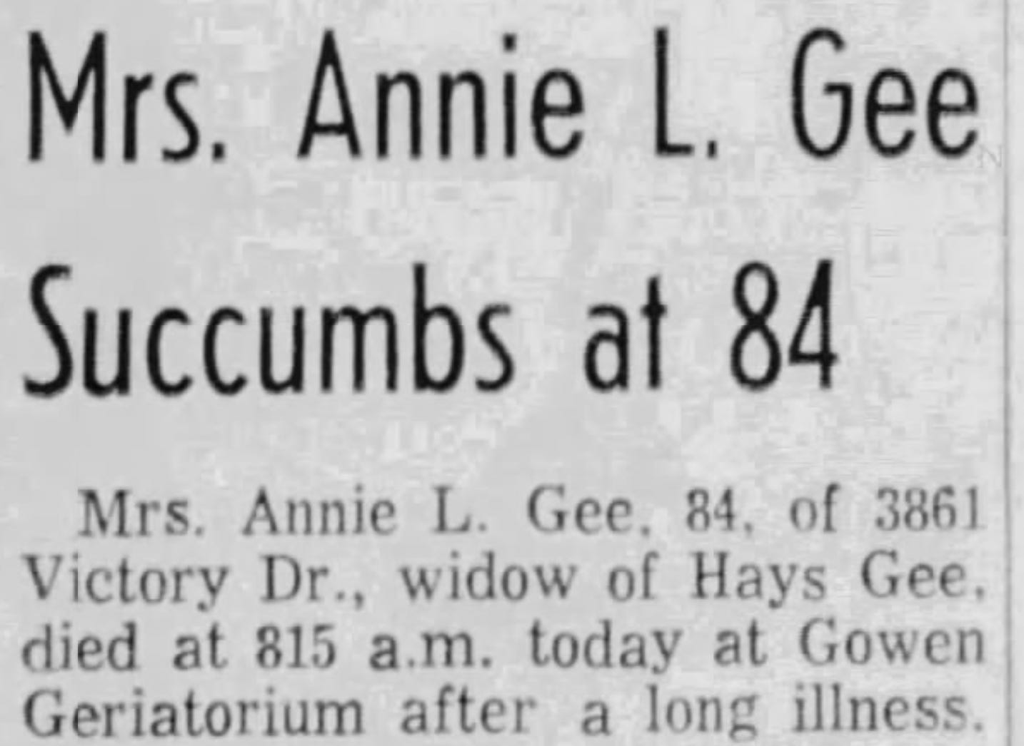 “Mrs. Annie L. Gee Succumbs at 84,” The Shreveport Journal (Shreveport, Louisiana), 24 July 1963, p. 8; digital image, Newspapers.com.