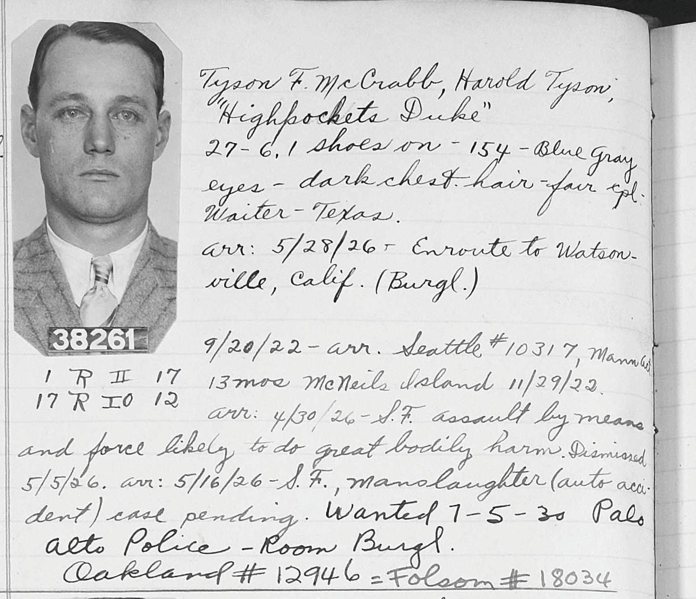 “Burglar Suspect Alleged to Have Lengthy Record,” Redwood City Tribune (Redwood City, California), 5 March 1927, p. 1; digital image, Newspapers.com. California Bureau of Criminal Identification report; aliases Howard Tyson McCrabb, Harold Tyson, and “Highpockets Duke.” See also: “Local Burlingame Suspect Has Lengthy Record Police,” Redwood City Standard (Redwood City, California), 10 March 1927, p. 8; digital image, Newspapers.com.