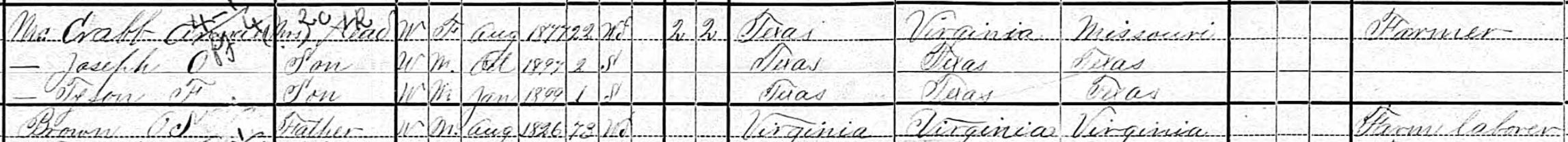 1910 U.S. census, DeWitt County, Texas, population schedule, Annie McCrabb household; digital image, Ancestry; citing NARA microfilm publication T624.