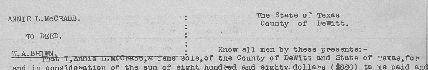 Annie L. McCrabb to W.A. Brown, deed, DeWitt County, Texas; dated 20 October 1906, recorded 22 October 1906; Vol. 58, p. 31, Deed Records of DeWitt County. Annie identified as “a feme sole.”