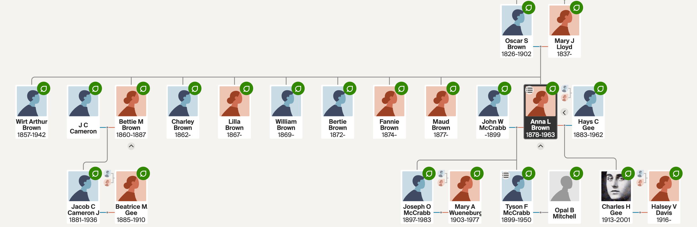 “Anna L Brown,” Ancestry profile, tree “Families of Historic Georgetown, Texas”; birth 1 August 1878, Austin, Texas; death about 1963; parents Oscar S. Brown and Mary Lloyd. This profile is maintained by the author and represents the current state of the research.