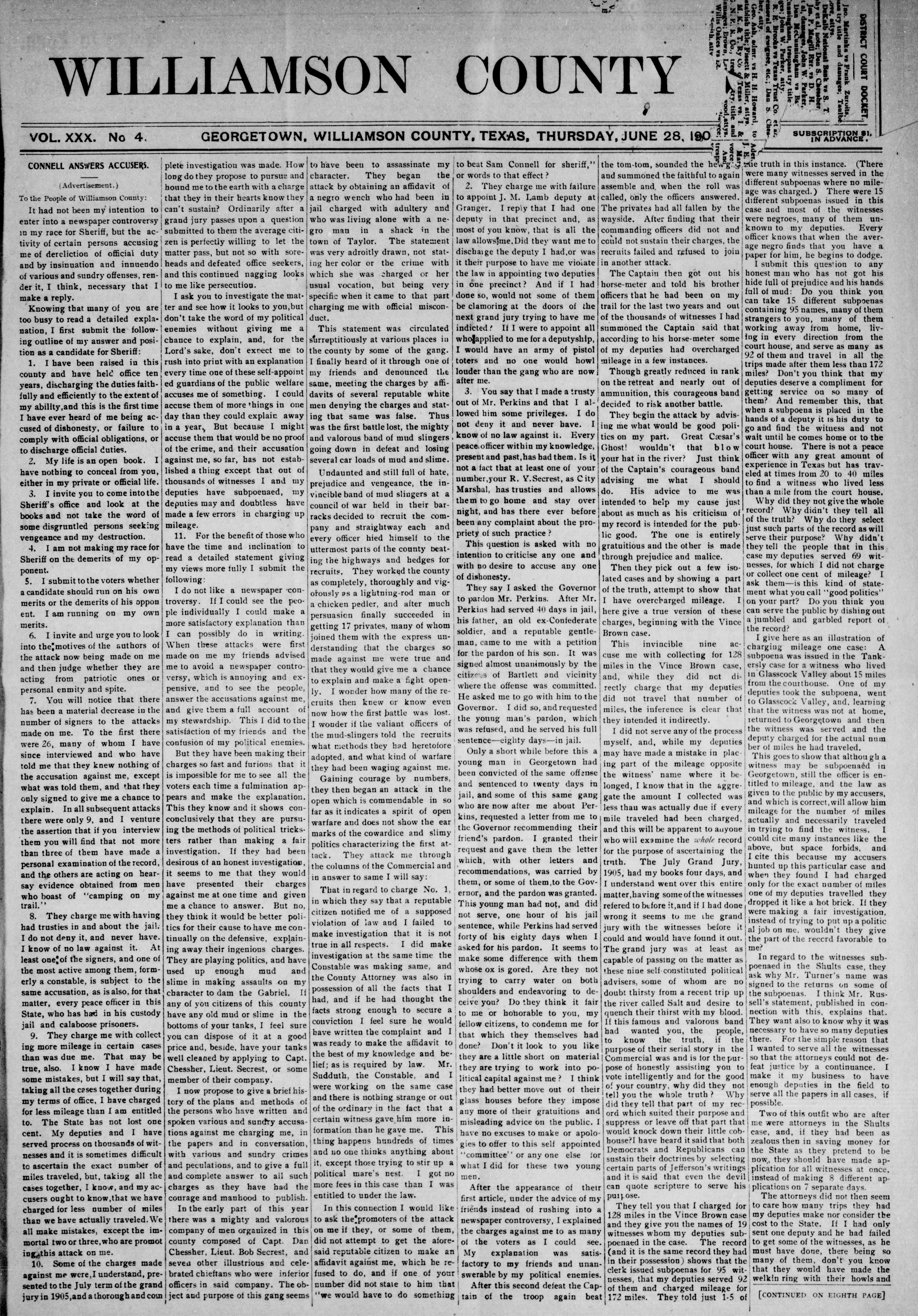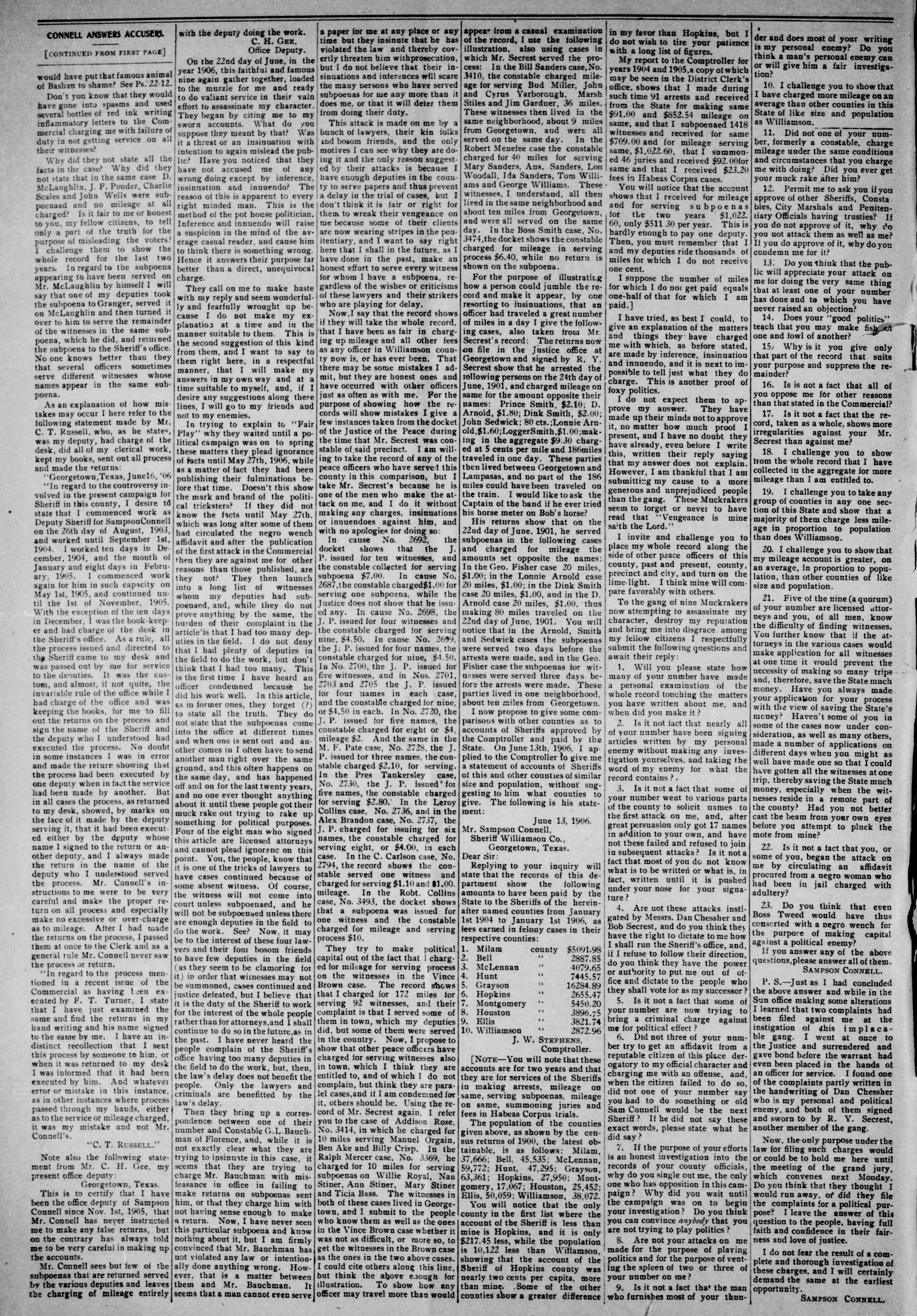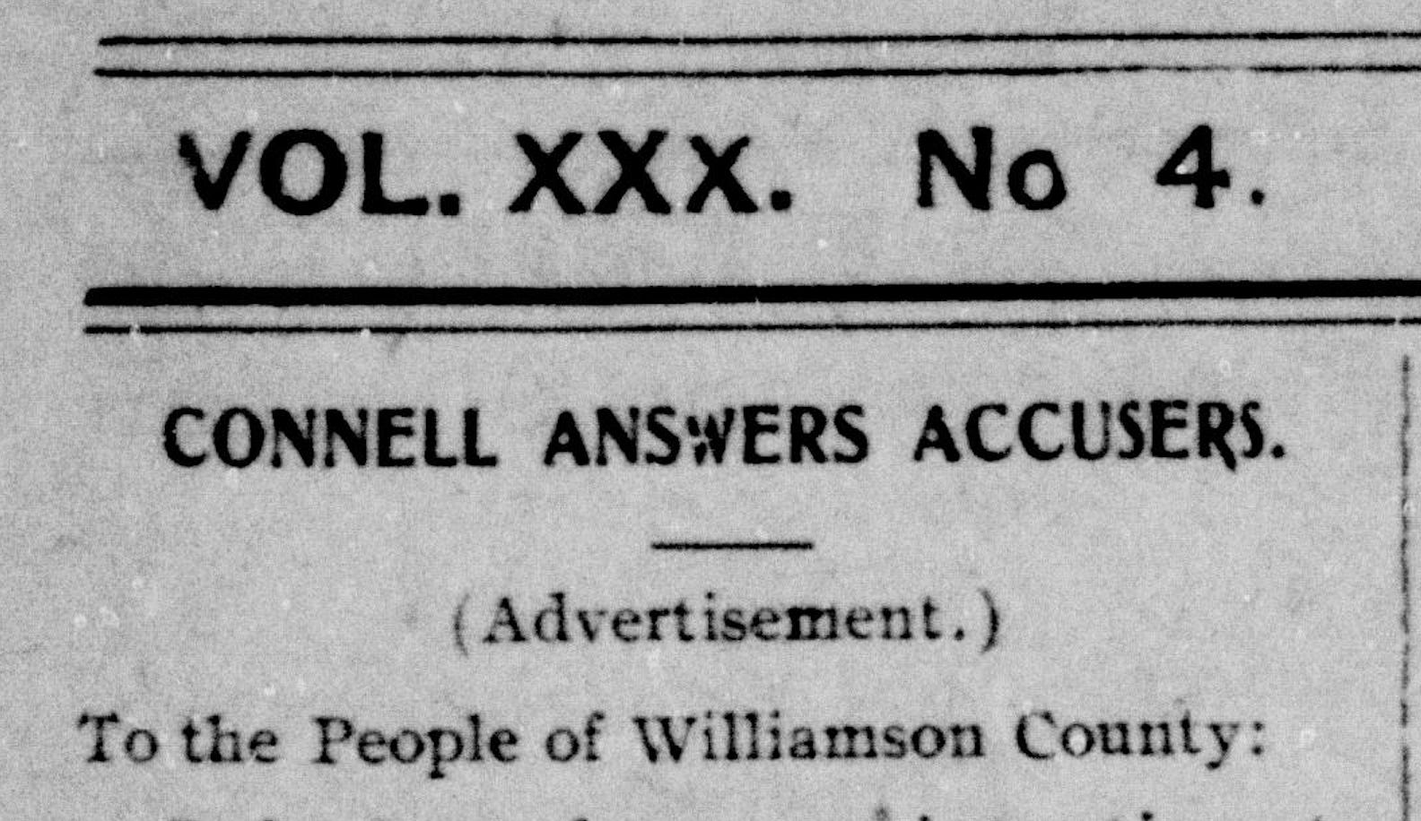 “Connell Answers Accusers,” The Williamson County Sun (Georgetown, Texas), 28 June 1906, pp. 1, 8; digital image, Newspaper Archive (newspaperarchive.com : accessed 4 April 2026).