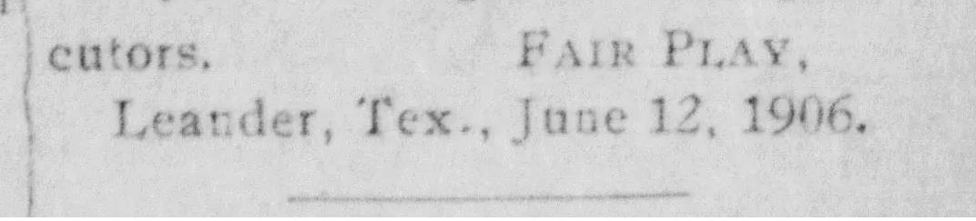 “Leander Locals,” The Williamson County Sun (Georgetown, Texas), 2 August 1906, p. 1; digital image, Newspaper Archive (newspaperarchive.com : accessed 13 April 2026).