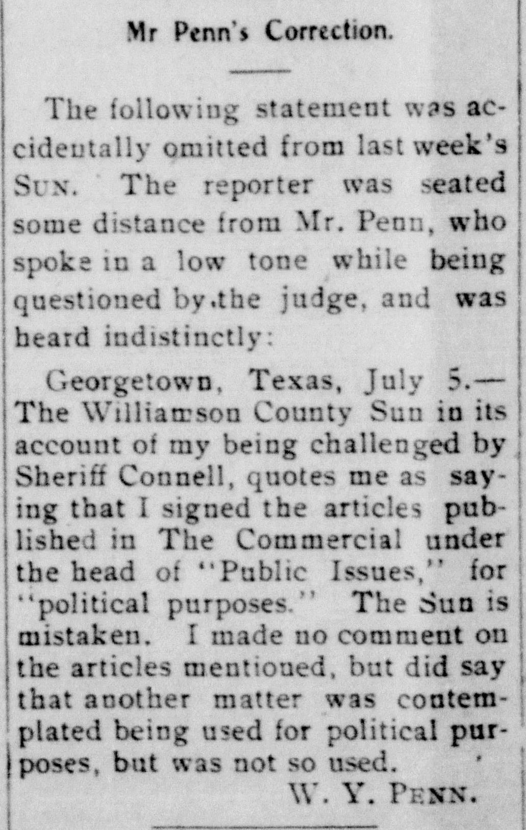 “Mr Penn’s Correction,” The Williamson County Sun (Georgetown, Texas), 19 July 1906, p. 2; digital image, Newspaper Archive (newspaperarchive.com : accessed 12 April 2026).