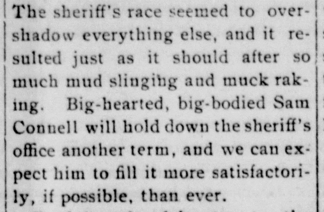 Sam Connell’s 1906 victory was not his last. He served several more terms as sheriff and in 1914 was elected to represent Williamson and Burnet counties in the Texas Legislature.