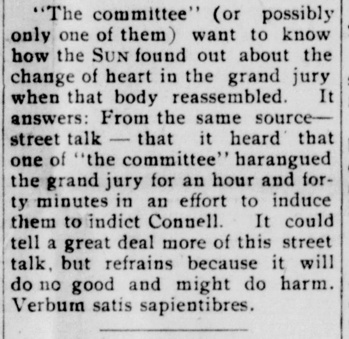 With Penn gone, the grand jury went to work. Remember the neutral paper, the one that wouldn’t take sides? When the indictment came down on Saturday, July 14, the Sun reported not just the indictment but the street talk about how it had been obtained: