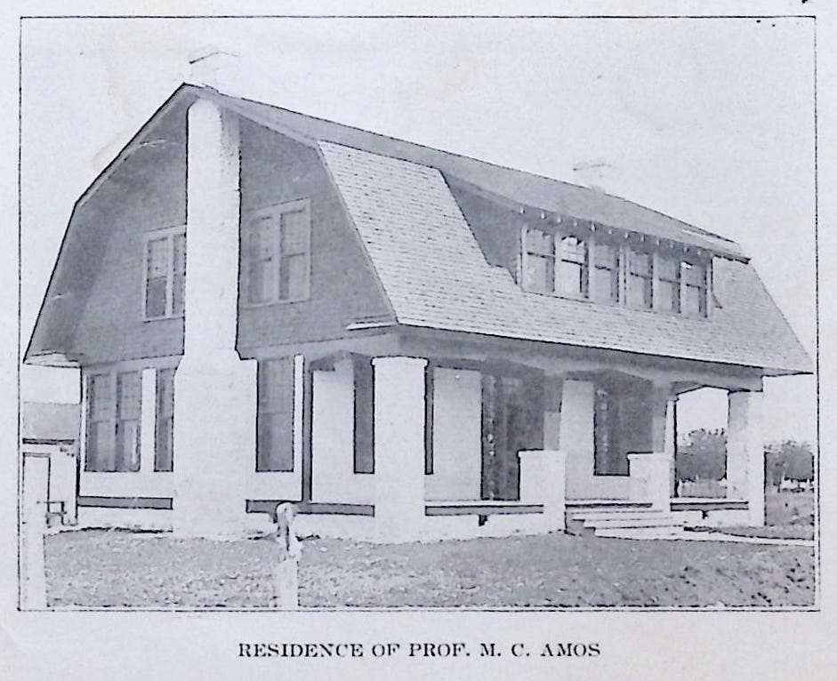 He married Mary Lewen Rutledge, whose family lived in Palestine, Anderson County, Texas. Their daughter Ruth was born in December of 1906. By the end of 1908, Amos had saved enough to purchase a lot on Olive Street and commission the C. S. Belford Lumber Company to build a home. The house that went up in 1909 was a two-story Shingle Style dwelling with a sweeping gambrel roof, stone chimneys, and a broad front porch. It appeared in the Georgetown Citizens Club book that same year, captioned simply “Residence of Prof. M. C. Amos.” He was 30 years old, with a prestigious academic post, a young family, and a brand-new home. Everything seemed to be falling into place.