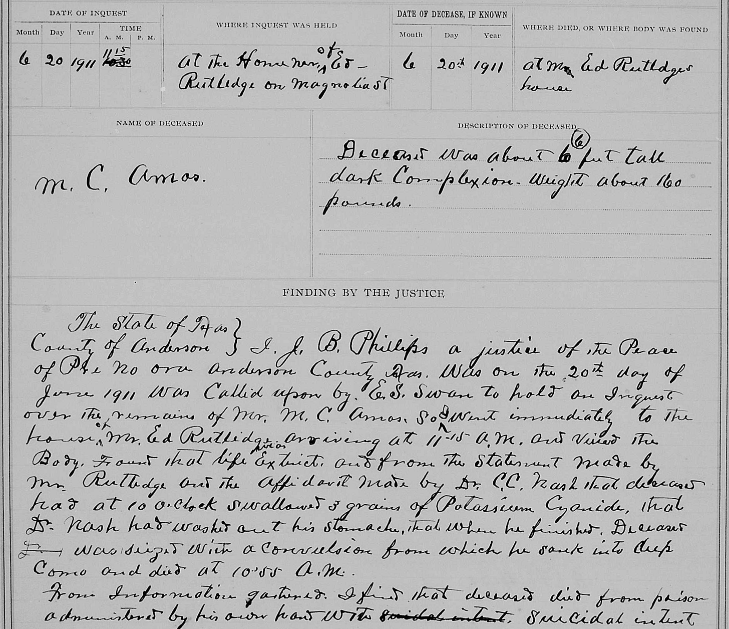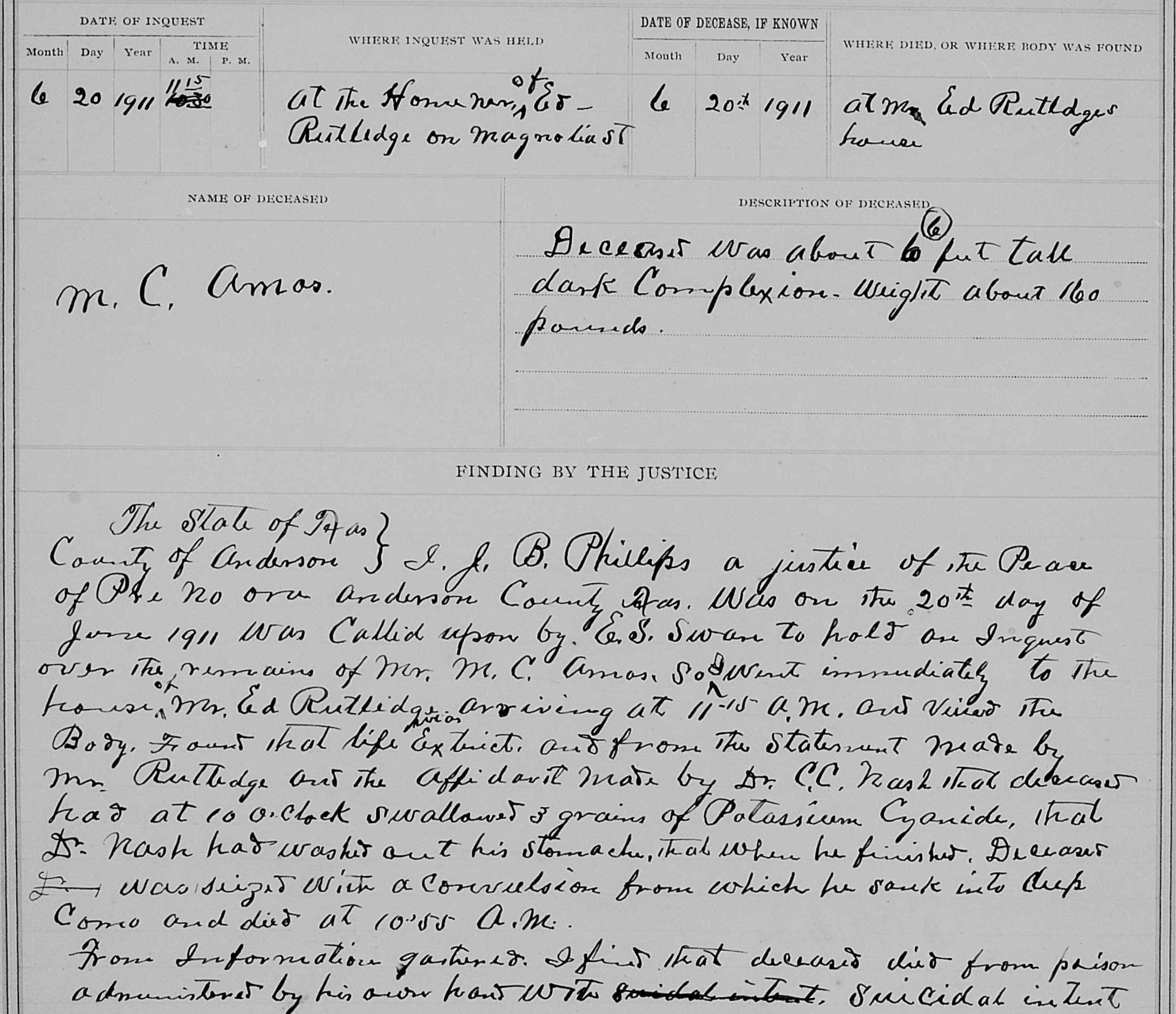 Inquest on the body of M. C. Amos, 20 June 1911, J. B. Phillips, Justice of the Peace, Anderson County, Texas; in “Anderson, Texas, United States records,” images, FamilySearch (familysearch.org/ark:/61903/3:1:3Q9M-C3SX-895N-5), image 79 of 1085.