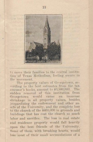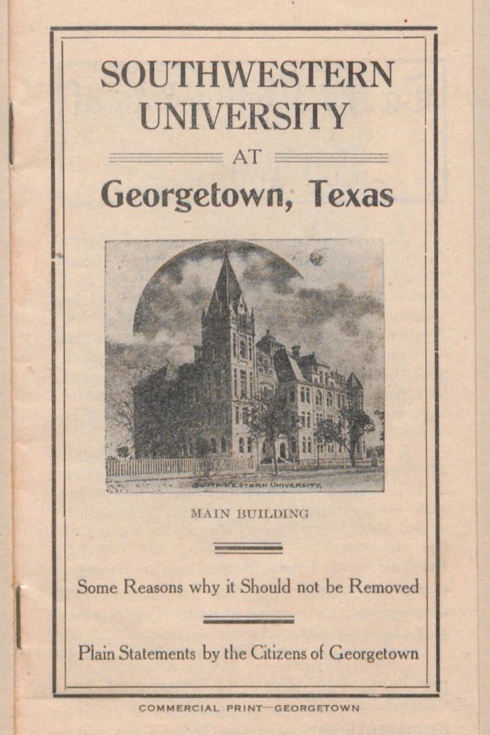 Booty, A. A.; Lockett, M. B. & Gillett, E. G. Southwestern University at Georgetown, Texas: Some Reasons why it Should not be Removed., pamphlet, ca. 1909; Georgetown, TX (https://texashistory.unt.edu/ark:/67531/metapth802477/ : accessed March 21, 2026); University of North Texas Libraries, The Portal to Texas History; crediting Southwestern University.