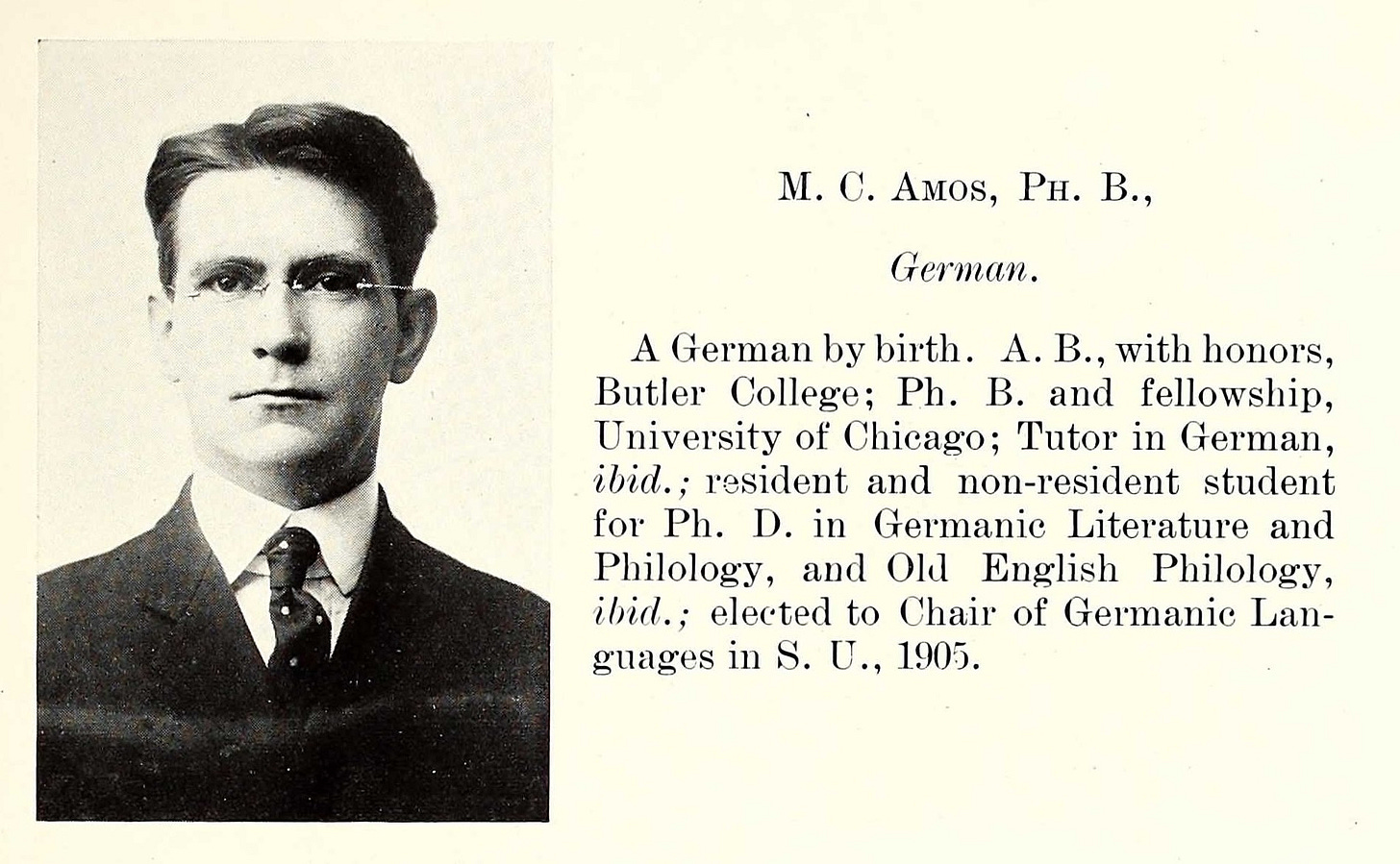 “M. C. Amos, Ph. B.,” Southwestern University faculty listing, Southwestern University Yearbook (Georgetown, Texas), 1909.